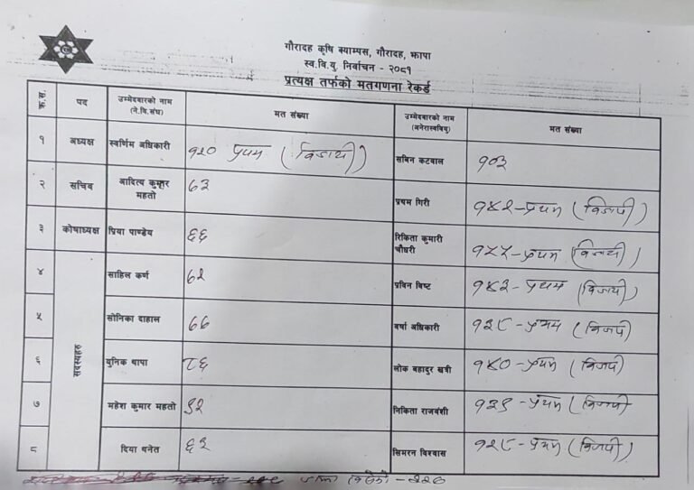झापा/ झापाको गौरादह कृषि क्याम्पसमा सम्पन्न विद्यार्थी संघको निर्वाचनमा नेपाल विद्यार्थी संघ (नेविसंघ) र अनेरास्ववियूबीच रोचक प्रतिस्पर्धा देखिएको छ। अन्तिम मत परिणामअनुसार सभापति पदमा नेविसंघका स्वर्णिम अधिकारी निर्वाचित भएका छन् भने बाँकी सबै पदमा अनेरास्ववियूका उम्मेदवारले जित हासिल गरेका छन्।