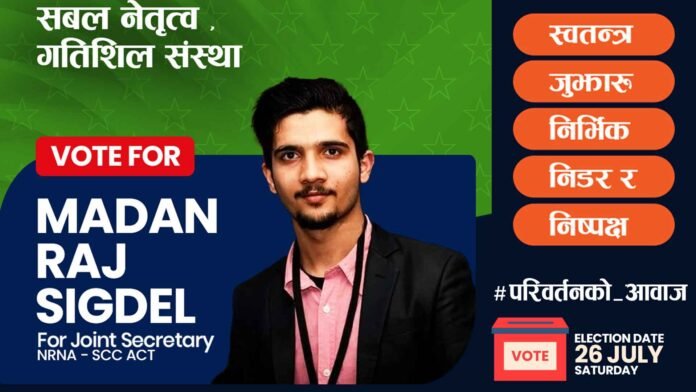 NRNA Australia को आगामी निर्वाचन यही जुलाई २६ तारिखका दिन सम्पन्न हुने तय भएको छ। NRNA Scc Act Joint Secretary पदका उम्मेदवार मदनले व्यक्त गरेको विचारशील अभिव्यक्तिले प्रवासी राजनीतिमा वैचारिक बहस र वैकल्पिक नेतृत्वप्रति नयाँ संवादको खाका कोरेको देखिन्छ ।