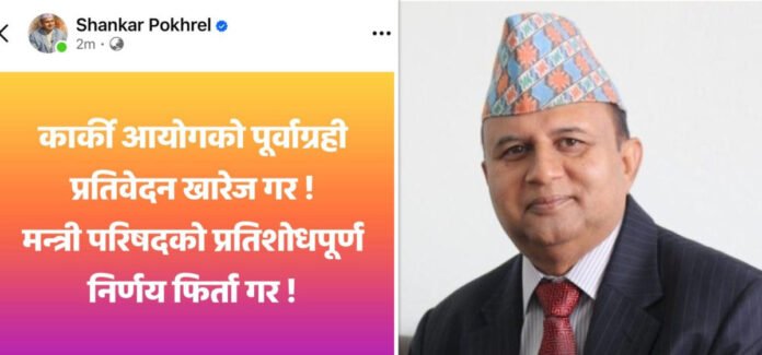 झापा/नेकपा एमालेका महासचिव शंकर पोखरेल ले कार्की आयोगको प्रतिवेदन खारेज गर्न माग गरेका छन्।