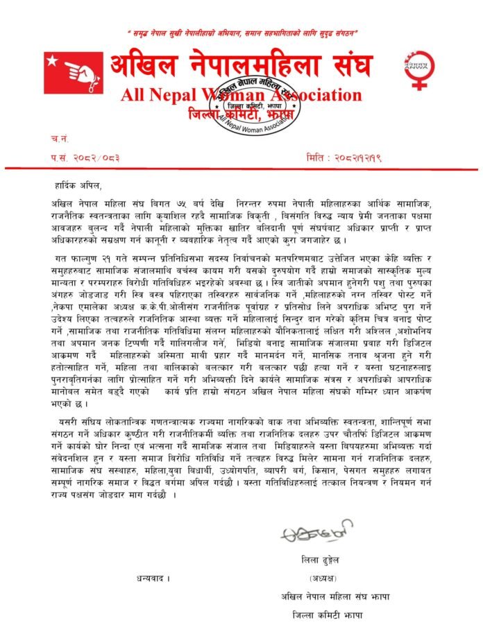 प्रेस विज्ञप्तीमा गत फाल्गुण २१ गते सम्पन्न प्रतिनिधिसभा सदस्य निर्वाचनको मतपरिणामबाट उत्साहित भएका केही व्यक्ति र समूहहरुबाट सामाजिक सञ्जालमार्फत चरित्र हत्या कायम गरी त्यसको दुरुपयोग गर्दै हाम्रो समाजको सांस्कृतिक मूल्य मान्यता र परम्परा विरोधी गतिविधिहरु भइरहेको उल्लेख छ । त्यस्तै स्त्री जातिको अपमान हुनेगरी पशु तथा पुरुषको अवतार जोडाई गरी स्त्री चरित्रमाथि गम्भीर प्रहार गर्ने, महिलालाई निन्दा गर्ने तथा नेकपा एमालेका अध्यक्ष केपि ओलीसँग राजनीतिक पूर्वाग्रह र प्रतिशोध लिन आपराधिक अभिप्राय पूरा गर्ने उद्देश्यले राजनीतिक आस्था व्यक्त गर्ने महिलालाई सिन्दूर दान गरेको कृत्रिम चित्र बनाई पोस्ट गर्ने, सामाजिक तथा राजनीतिक गतिविधिमा संलग्न महिलाहरुको योग्यता र क्षमतामाथि लक्षित गरी अश्लील, अशोभनीय तथा अपमानजनक टिप्पणी गर्ने, भिडियो बनाई सामाजिक सञ्जालमा प्रवाह गरी डिजिटल आक्रमण गर्दै महिलाको अस्मिता माथि प्रहार गर्ने, मानसिक तनाव सिर्जना गर्ने गरी क्रियाकलाप गर्दै महिलाहरुको बलात्कार गरी हत्या गर्ने जस्ता घटनालाई प्रवर्द्धन गर्ने मनोवृत्ति समेत बढ्दै गएको कार्य प्रति हाम्रो संगठन अखिल नेपाल महिला संघको गम्भीर ध्यान आकर्षण भएको छ।